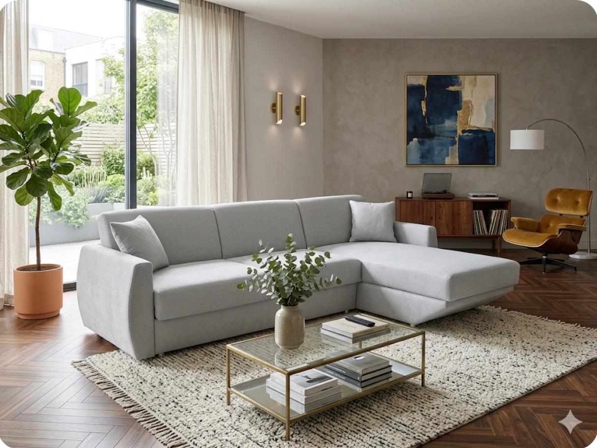 * *Versatilitate:* Nuanța neutră de gri și picioarele discrete permit accesorizarea ușoară cu perne colorate sau pături texturate, în funcție de stilul tău.