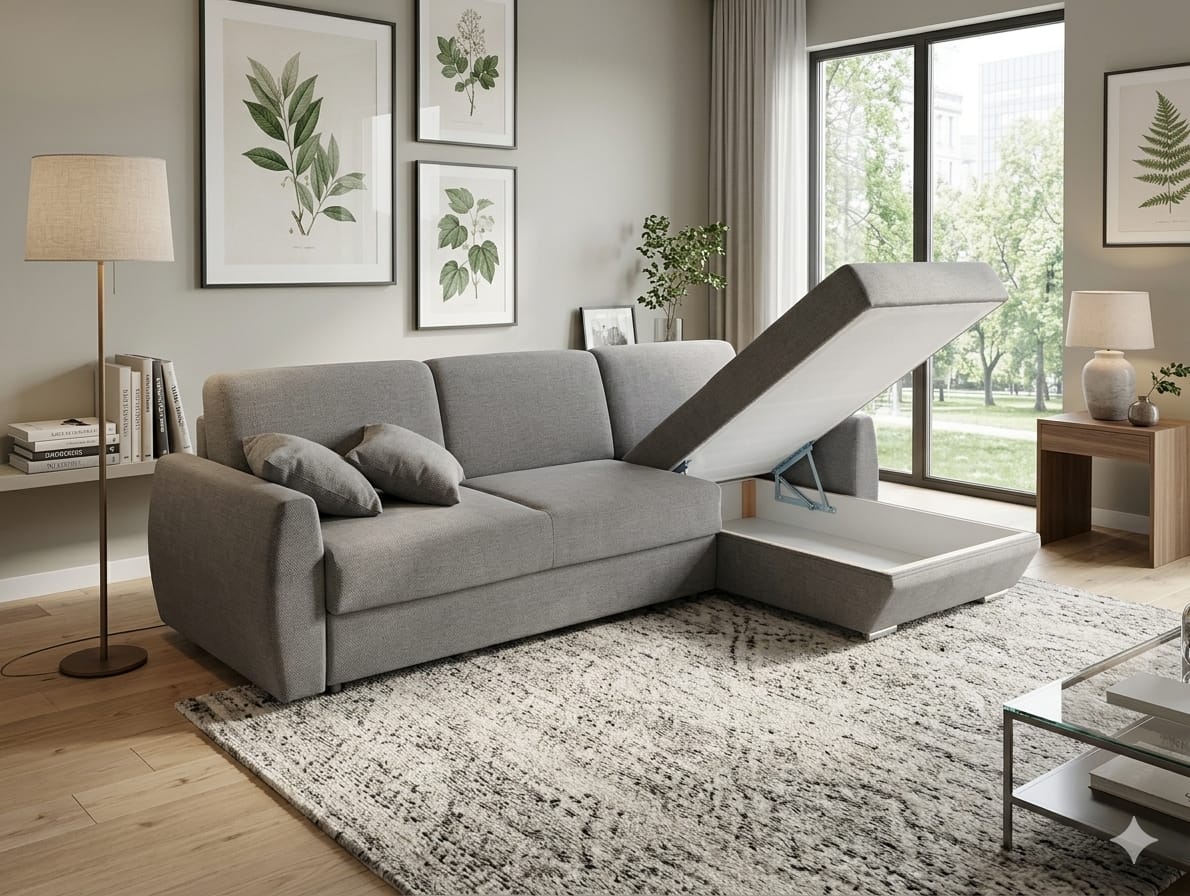 Colțarul extensibil *Serena* (275×175 cm) combină designul modern cu utilitatea, oferind o ladă de depozitare spațioasă și un sistem de dormit robust pe somieră metalică de 190×140 cm.